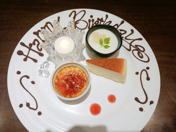 菜厨瑠です。記念日コース(7,000円)なら無料で。他のコース(ランチ含む)はデザートが付いてるので、+200...