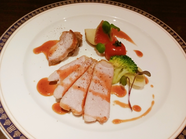 菜厨瑠です♪5000円コースの豚肉のお料理です。こちらは千葉県の銘柄豚「林SPFポーク」を使っております...