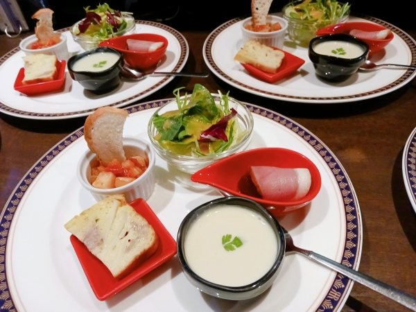 盛り合わせの一品、赤い涙型の器には合鴨ロースのスモークとかぼちゃサラダが入っています。オーブンで...